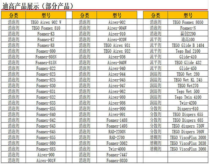 ACEMATT°、AEROSIL°、SURFYNOL°、TEGO°、ZEOLEX°等馳名全球的贏創(chuàng)品牌組成了廣泛的產(chǎn)品組合,包括傳統(tǒng)的添加劑(消泡劑、脫泡劑、分散劑等)、消光粉、流變助劑、填料、輔助機(jī)品、樹(shù)脂(包括有機(jī)硅樹(shù)脂和納米樹(shù)脂)。